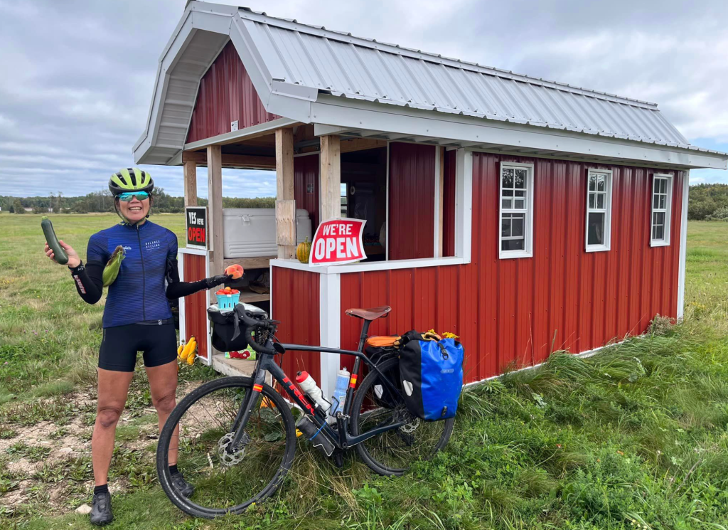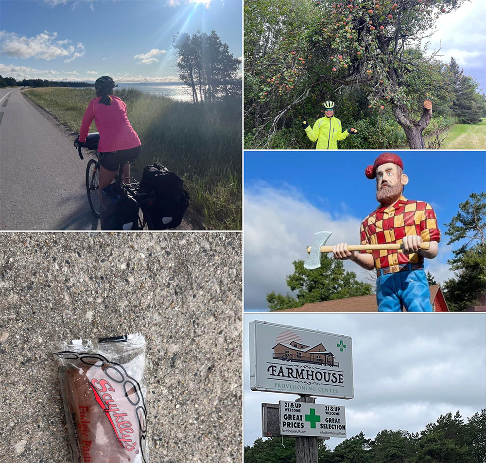 We’re tired. We’re windburned. We’re cold. And we’re hungry. And we only have a mile or two before we ride into the last “town” of the day before our campsite: Naubinway. Pretty much at our lowest point of the day. We’ve been scrounging for dinner supplies. Best vegetable: iceberg lettuce. We didn’t bother. Anything else? One shriveled little onion from the chain smoker lady.