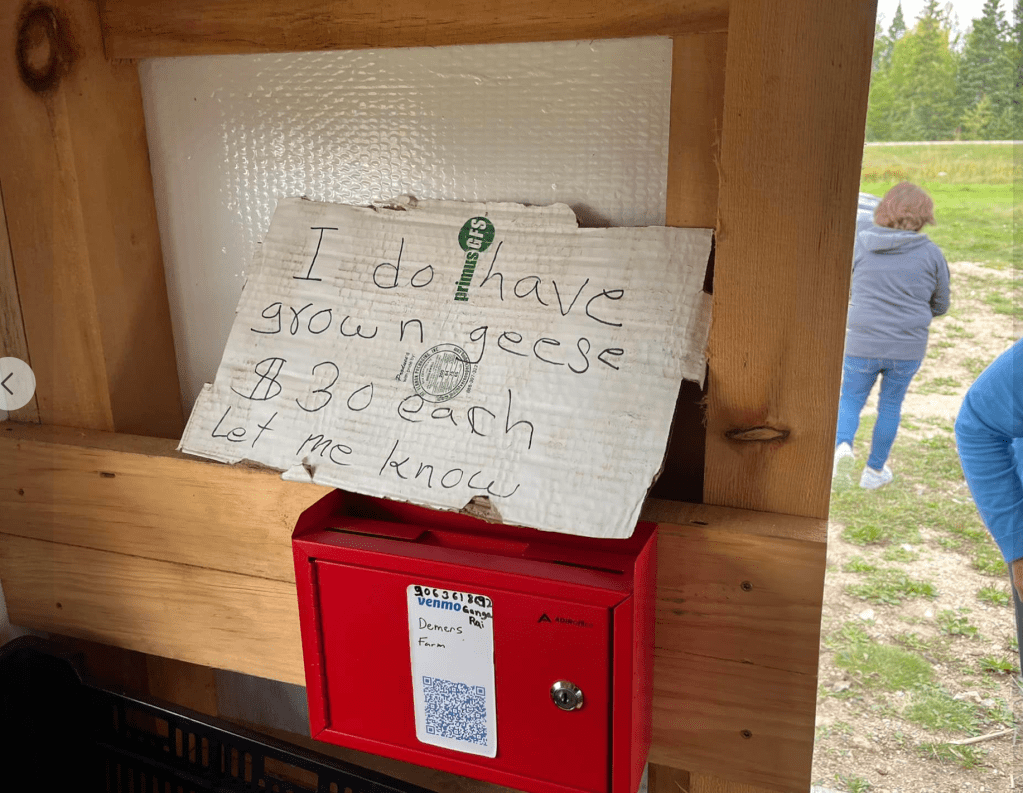 No, much better than that. A farm stand. Michigan peaches. Plums. Pears. Apples (we didn’t buy any apples – we have our own supplies . . .). Cherry tomatoes. Zucchini. Corn. You could even purchase “grown live geese” for $30. I mean, we didn’t. But it’s the principle!