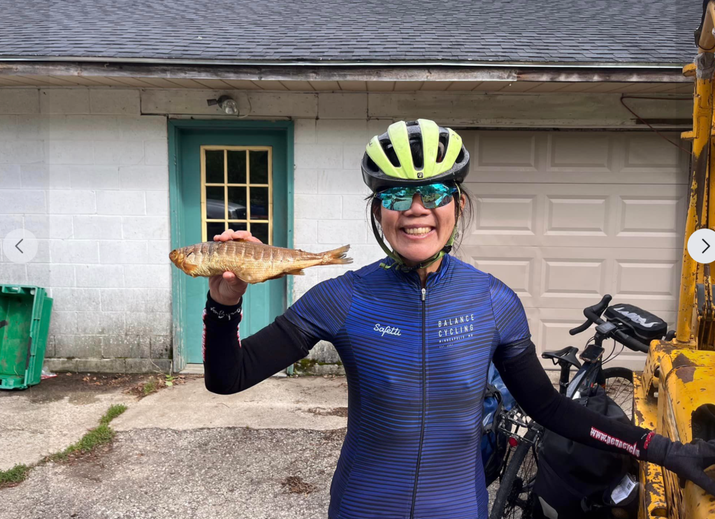 Now we’re thinking about how to kill time while Allen drives over from Marquette . . . But before we can take our helmets off Allen drives up. He goes right in the unlocked door with his phone number on the note and pulls out a big tray full of fish fillets.