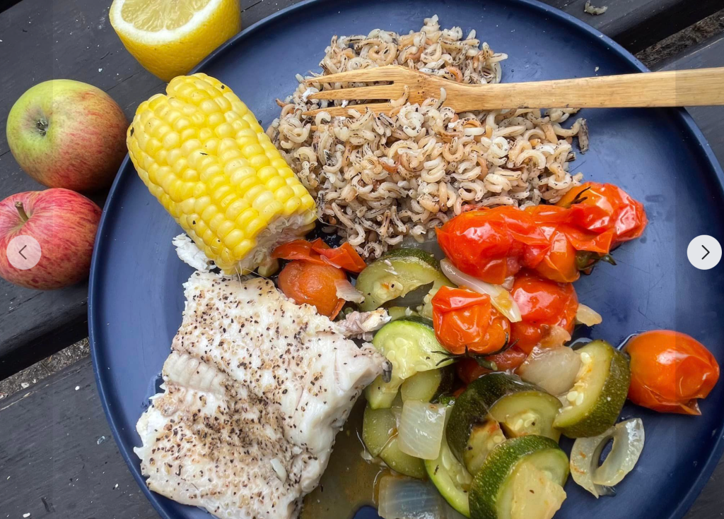 Dinner was amazing. Fish, veggies and wild rice were wonderful. Baked apples (and peach) were molten heaven.