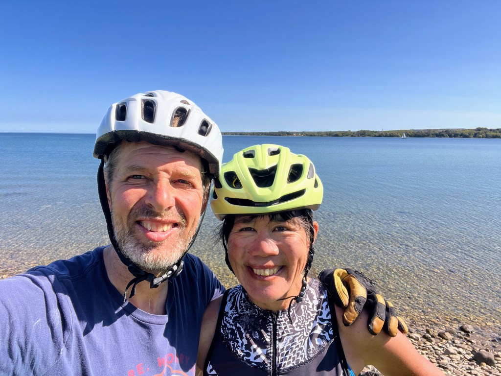Eventually we made it to Meaford – another Georgian Bay town (Georgian Bay is officially part of Lake Huron but I guess Lake Huron-ites view Georgian Bay quite differently from the rest of the lake because it is deeper and colder. Which, from our Lake Superior perspective is funny – because it’s like bath water compared to Gitchee Gumee). We’re in a great campground on the beach, had fajitas for dinner (and they actually had a fire grate for the first time since Wisconsin – small miracles!), and then Diana made her now famous baked apples for dessert. Kind of funny – we weren’t sure we had any apples left – turns out that there were six stow-aways in various parts of our baggage. No wonder those hills were hard today . . .